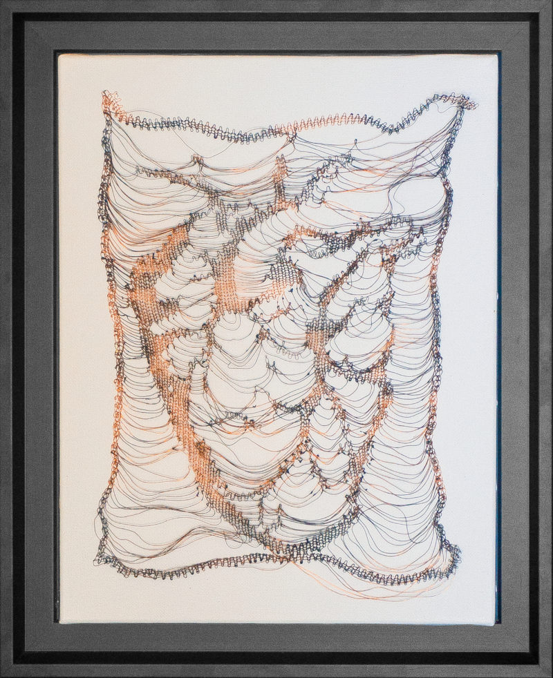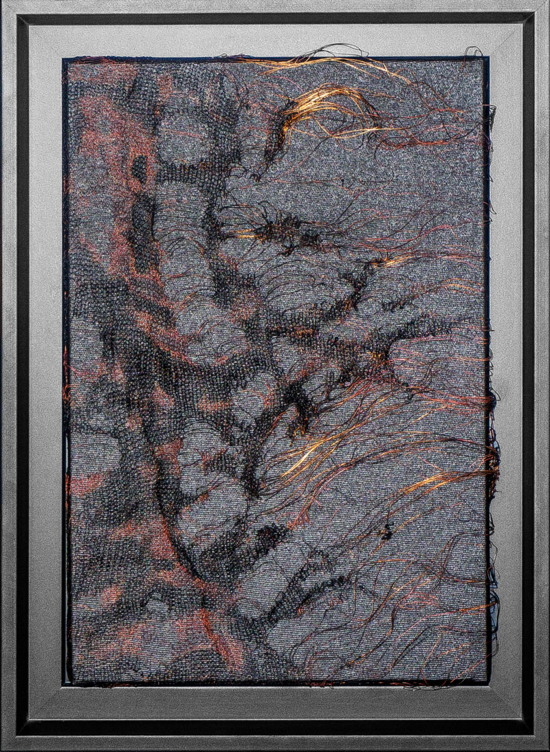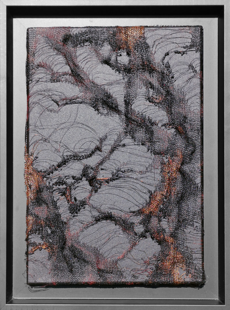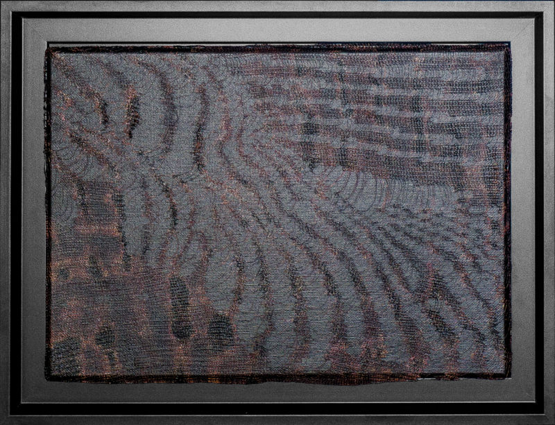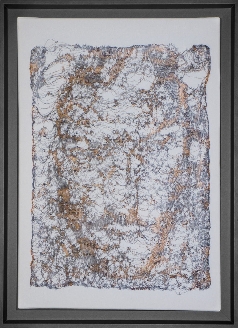 Une fois traduites en Maille, je les travaille en jacquard de cuivre et de coton. Les deux matières ayant un comportement différent, leur association crée des déformations. L’image est tordue, brouillée, et lisse. Sa vraie forme sera révélée par les flammes. La mise en déformation vient surprendre, altérer, prolonger … l’idée initiale. Je brûle le coton, qui ne servait que d’« échafaudage » au cuivre. Puis, je viens modeler le « Fire-Kopper » sur la toile afin de créer une image en volume.